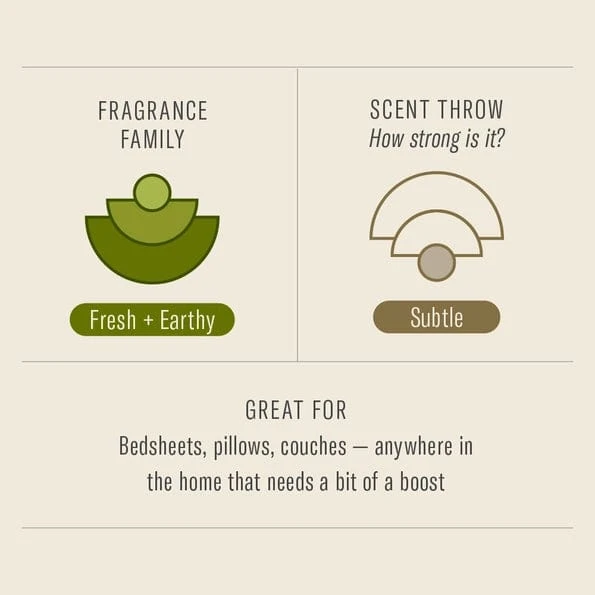 The perfect everyday scent. Picture a weekend in the mountains, sun gleaming through the canopy. Notes of sage, moss, and lavender. This spray offers an effortless, fine mist with a light fragrance! Meant for daily use on bedsheets, pillows, couches – anywhere that needs a bit of a boost.