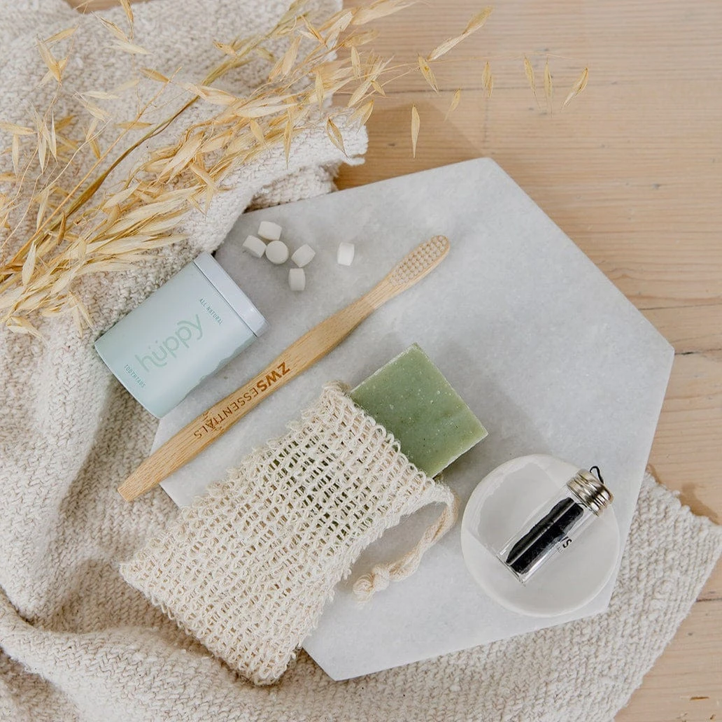 Our ZWS Essentials Bamboo Toothbrush is completely plant-based: bristles, handle, and box. Made from castor bean oil, organic bamboo, and paper!
