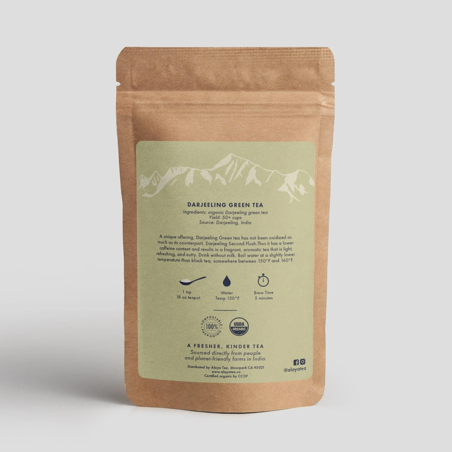Sourced from a certified organic and biodynamic tea estate at the base of the Himalayas, our Darjeeling Green Tea is crafted with eco-conscious practices. The 100% compostable packaging—including the label and zipper—ensures minimal environmental impact, making this tea a zero-waste choice.