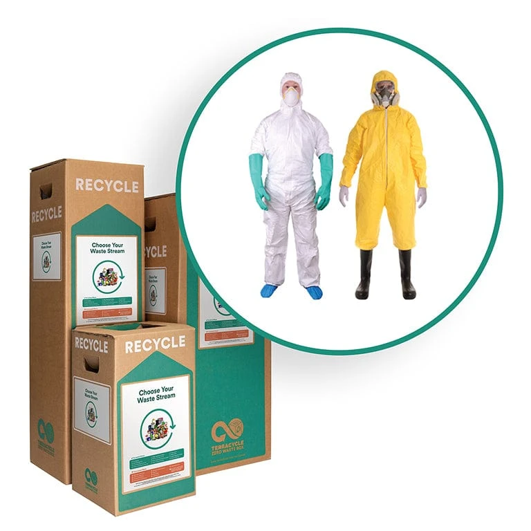 With TerraCycle’s Zero Waste Boxes, you can collect your hard-to-recycle materials, and ship them to TerraCycle for free! Terracycle will then properly recycle the items. With the Disposable Garments Zero Waste Box, you can recycle discarded disposable garments, chemical protection suits, flame resistant suits, smocks and nitrile gloves that would otherwise be headed to the landfills!