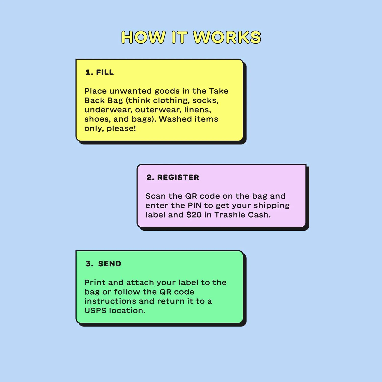 Step 2: Send It Back for Free: Scan the QR code on your bag for shipping instructions. The easiest option is to drop off your Take Back Bag at any Happy Returns location. Alternatively, you can print a mailing label for UPS. The QR code on your bag and the Happy Returns QR code are different.