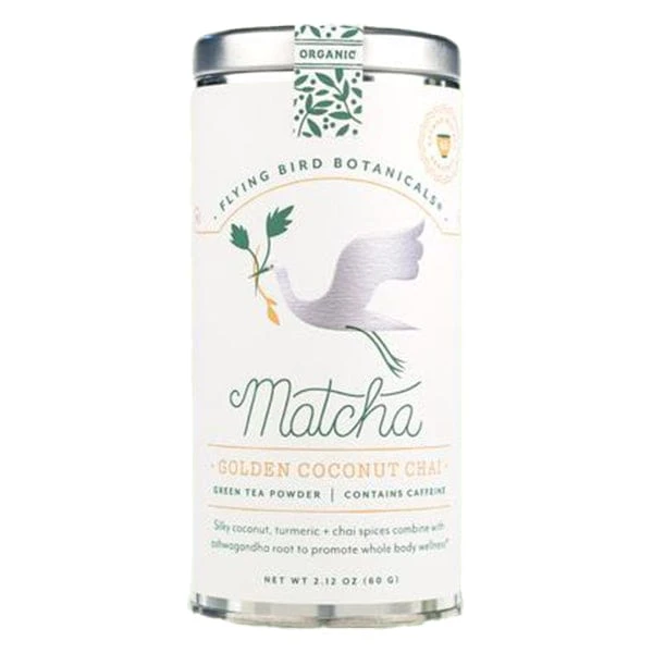 Get ready for a tasty, organic treat with the Golden Coconut Chai Matcha Tea from Flying Bird Botanicals. Combining premium ground Tencha tea leaves from Japan, coconut, turmeric, and chai spices, this blend is enhanced with Ashwagandha root for a calming effect. Each batch is carefully crafted with locally sourced herbs and responsibly sourced ingredients. Packed in recycled steel tins, this matcha powder offers up to 60 servings of deliciousness. So grab your mug and enjoy a cup of tea that will leave you feeling satisfied and guilt-free!