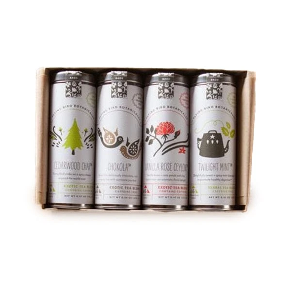 Spread holiday cheer with Flying Bird Botanicals’ Holiday Cheer Tea Gift Box Set! Featuring 4 unique blends made from locally grown herbs and ethically sourced ingredients, this set promotes sustainability while providing a satisfying tea experience. Each Tin includes 16 organic tea bags made from biodegradable corn-based materials, reducing waste without compromising quality. Enjoy the essence of the holidays in each delicious and sustainable cup of herbal tea. Each set is packaged in a charming kraft box with a letterpressed hang tag, enclosing four tins of tea with six eco-friendly pyramidal tea bags each.