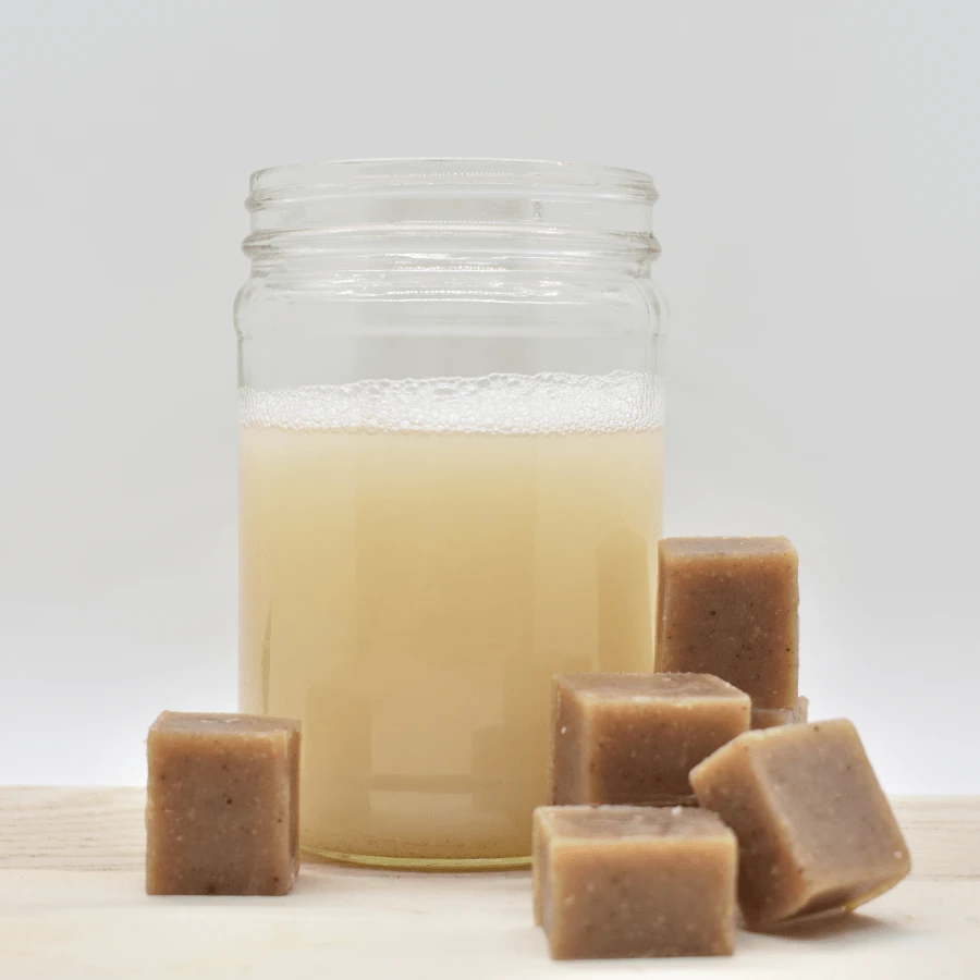 Ingredients: saponified oils of coconut & olive, soap nuts liquid, yucca powder, baking soda, oxalic acid, salt, and rosemary oleo resin