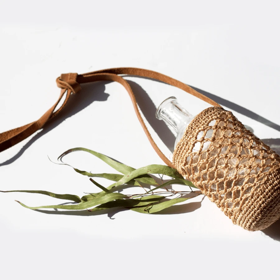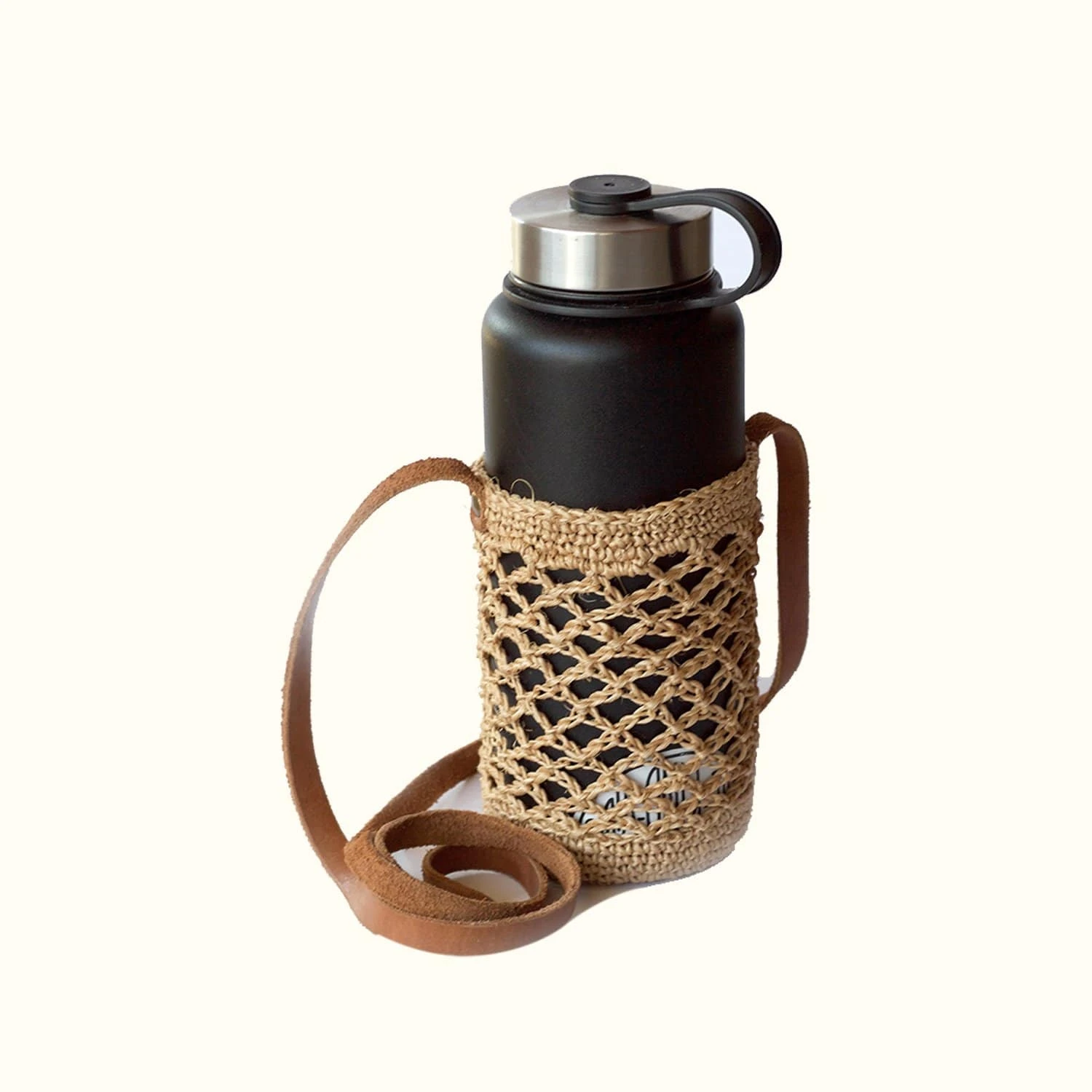 Handmade from skilled artisans, this crocheted water bottle holder design with a crossbody strap is fun and functional. Holder is round and flat at the base and the natural fiber is strong and durable yet flexible