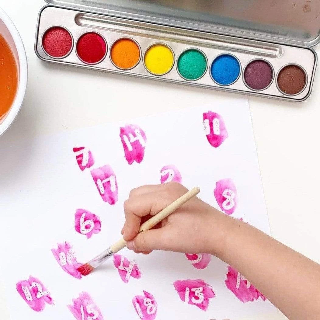 Watch your little artist shine with our Natural Water Color Paint set in 8 vibrant colors. Using food-grade natural ingredients, you can have peace of mind while their imagination runs wild. Complete with a natural wooden paintbrush they can conveniently create right out of the gates.