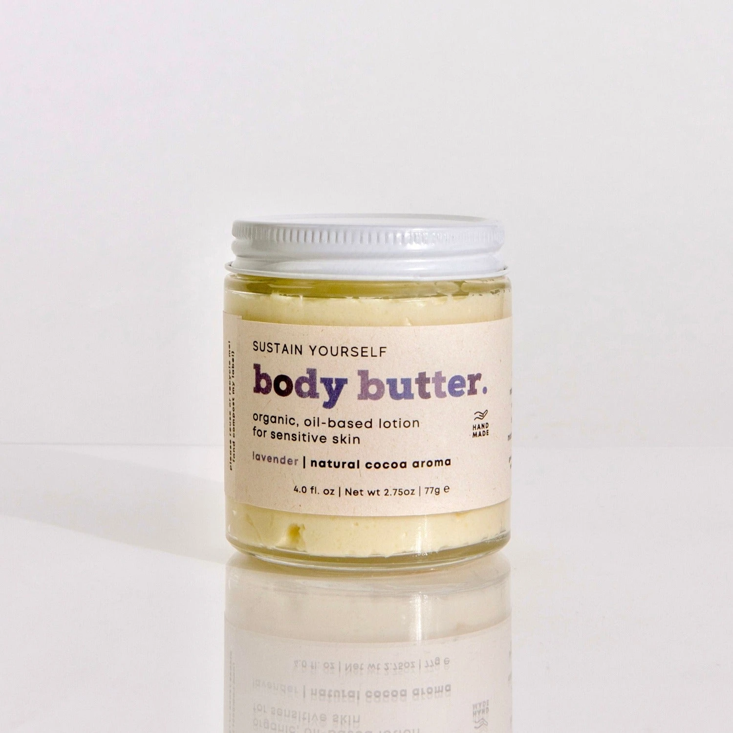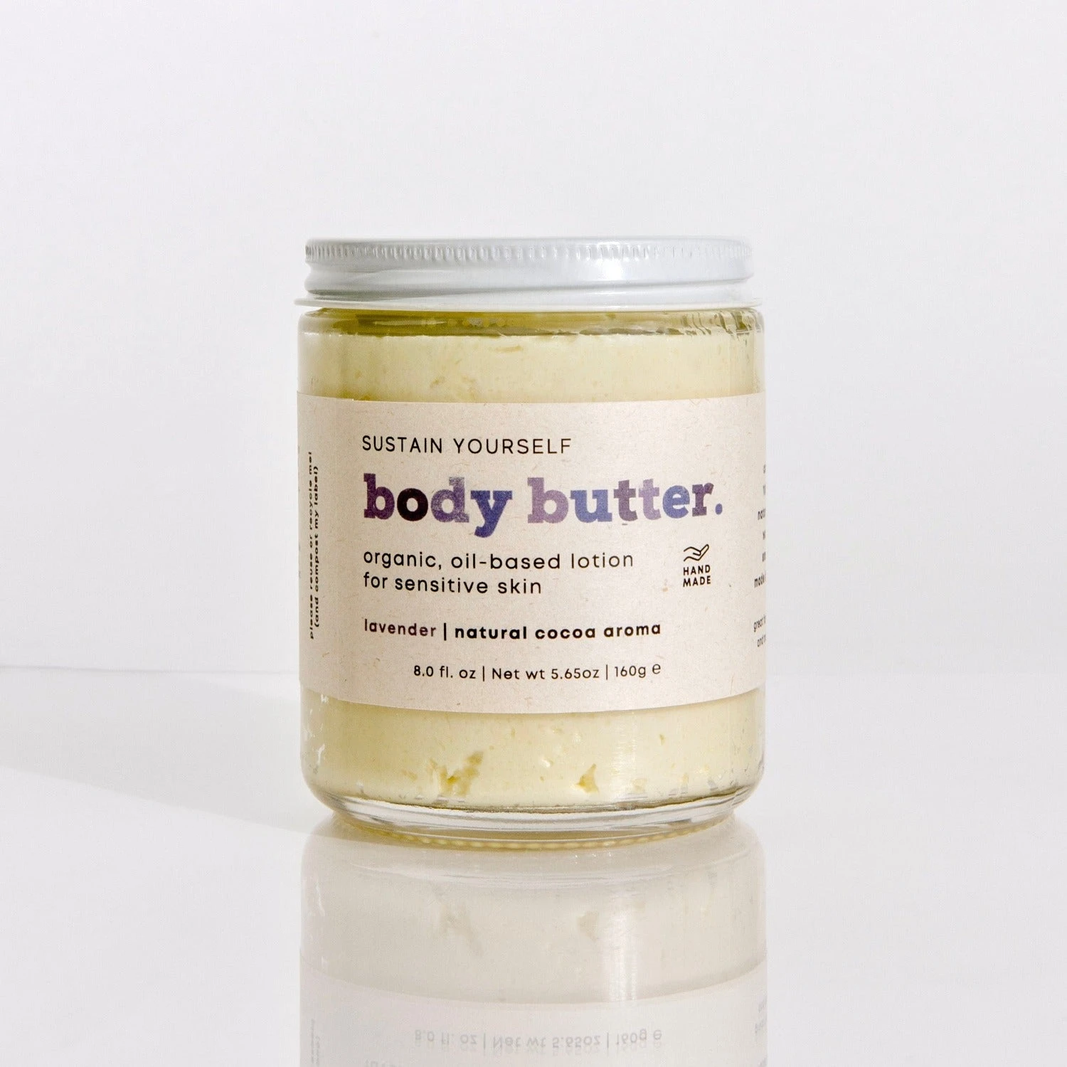 Handmade & whipped by hand, our organic body butter is made with four rich ingredients that nourish, replenish, and hydrate your skin, leaving it soft and silky. Great for everyday use, massages, and for application after shaving.