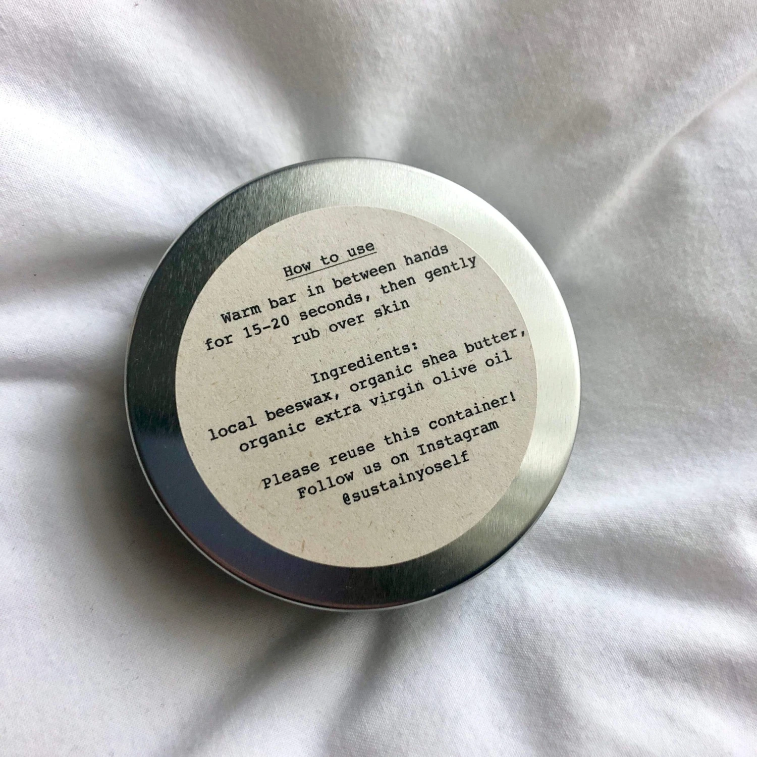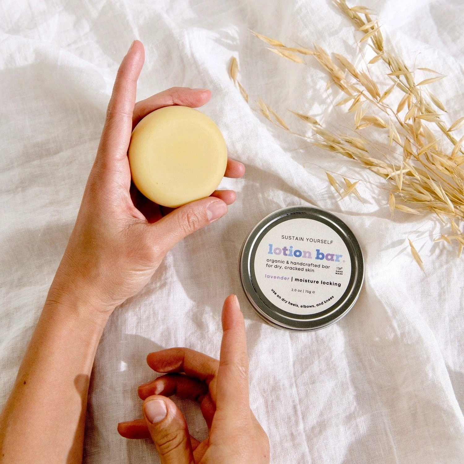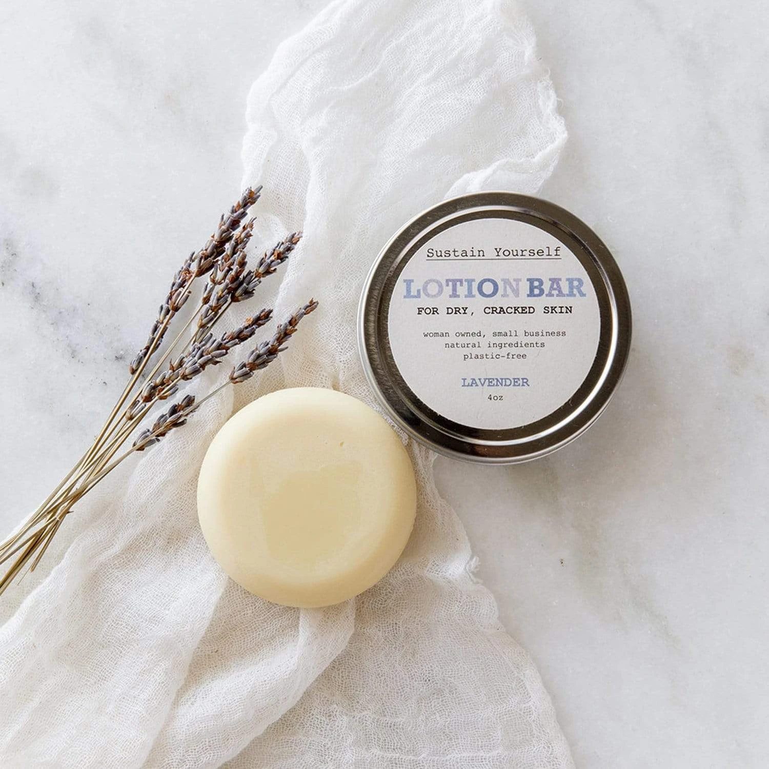 Our solid, nutrient-packed Lotion Bar is made from all-natural plant oils and butters that moisturize, heal, and soothe dry skin. Handmade in small batches with organic ingredients, our Sustain Yourself Lotion Bars last far longer than liquid lotions (months!), are zero waste, and made with sustainable ingredients. The oils will absorb very quickly into your skin, leaving it feeling healthy and soft. Great for travel, keeping it in your purse, or near your nightstand!