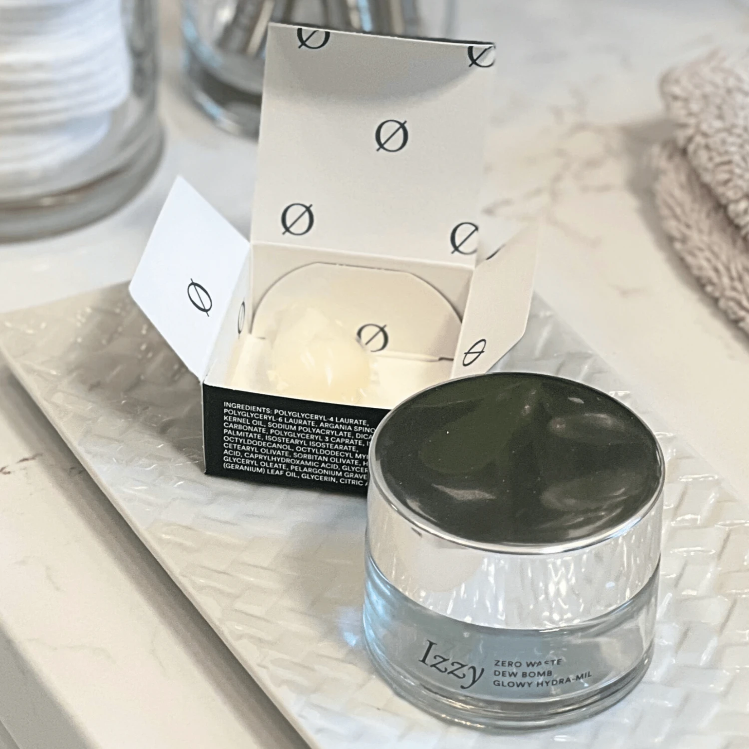 Izzy’s Dew Bomb refills arrive in a water-soluble pod to be used with Izzy’s dishwasher-safe refillable Dew Bomb jar (if you don’t have a jar, purchase a Starter Kit here). Pods dissolves completely in water to form a moisturizing milk. Learn how to use this hydrating face serum here.