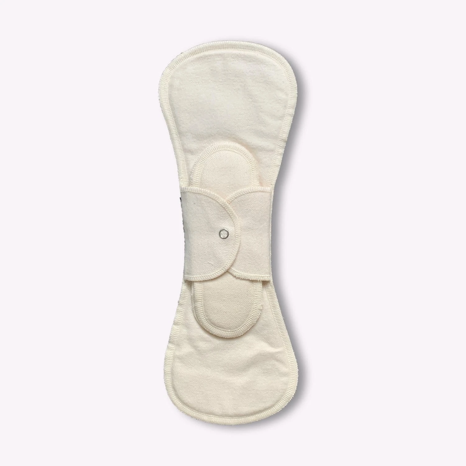 Cleaning & Care: Separate inserts from the holder. Soak in cold water, if desired, to help prevent staining. Use the pre-soak function on your washing machine, or soak in a covered rust-proof container. Change soaking water often. Machine wash cold using a natural detergent or hand-wash and tumble dry low or line dry (preferred method). Do not use bleach or fabric softener. Store flat to eliminate wrinkling. Store your pads in a clean, dry place until next use.