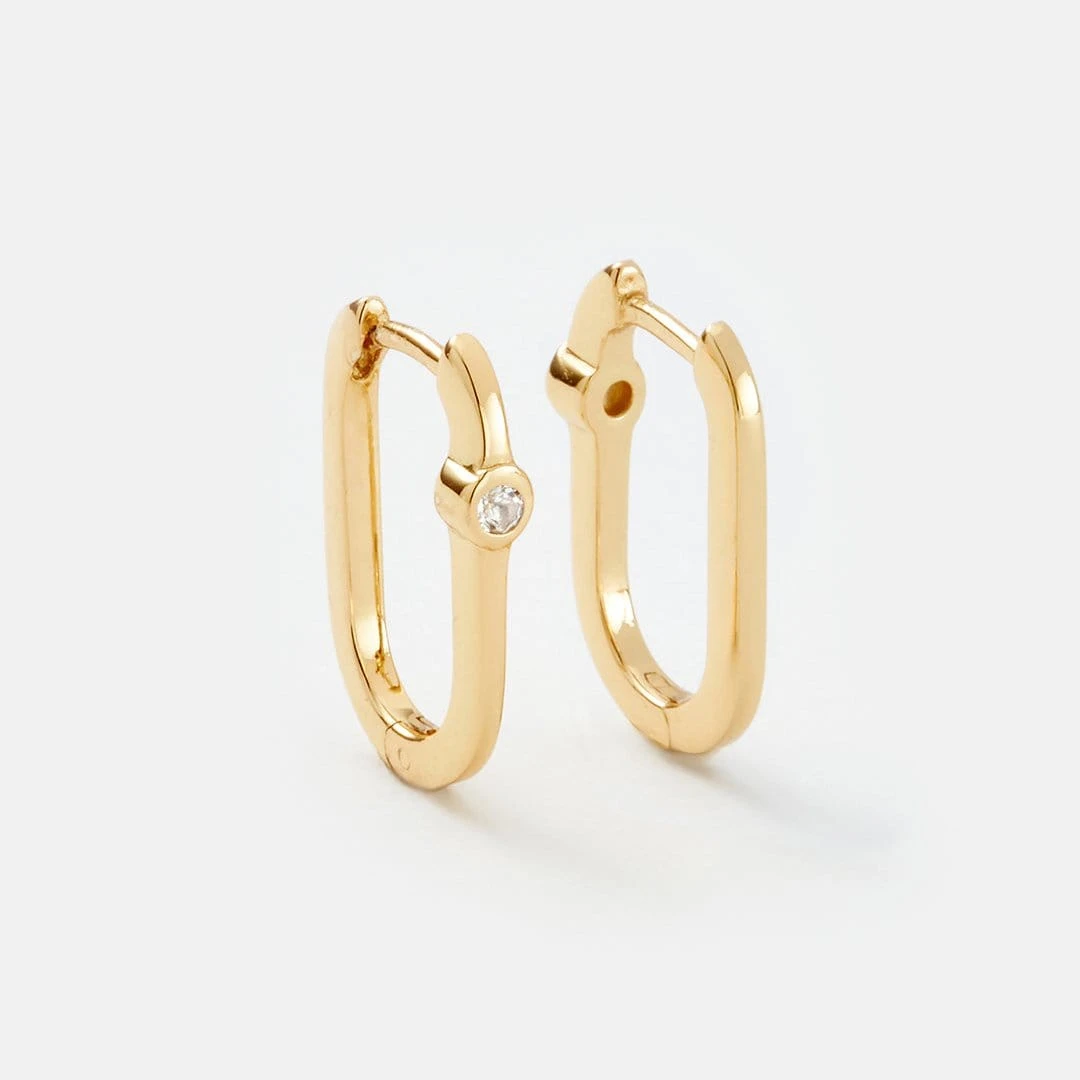 This exquisite midi hoop earring boasts a dainty white topaz stone on one side, providing a distinctive and attention-grabbing appearance. Its reversible nature showcases a simplistic design, giving you the option to turn it over for a sleek gold finish. Versatile and perfect for everyday wear!