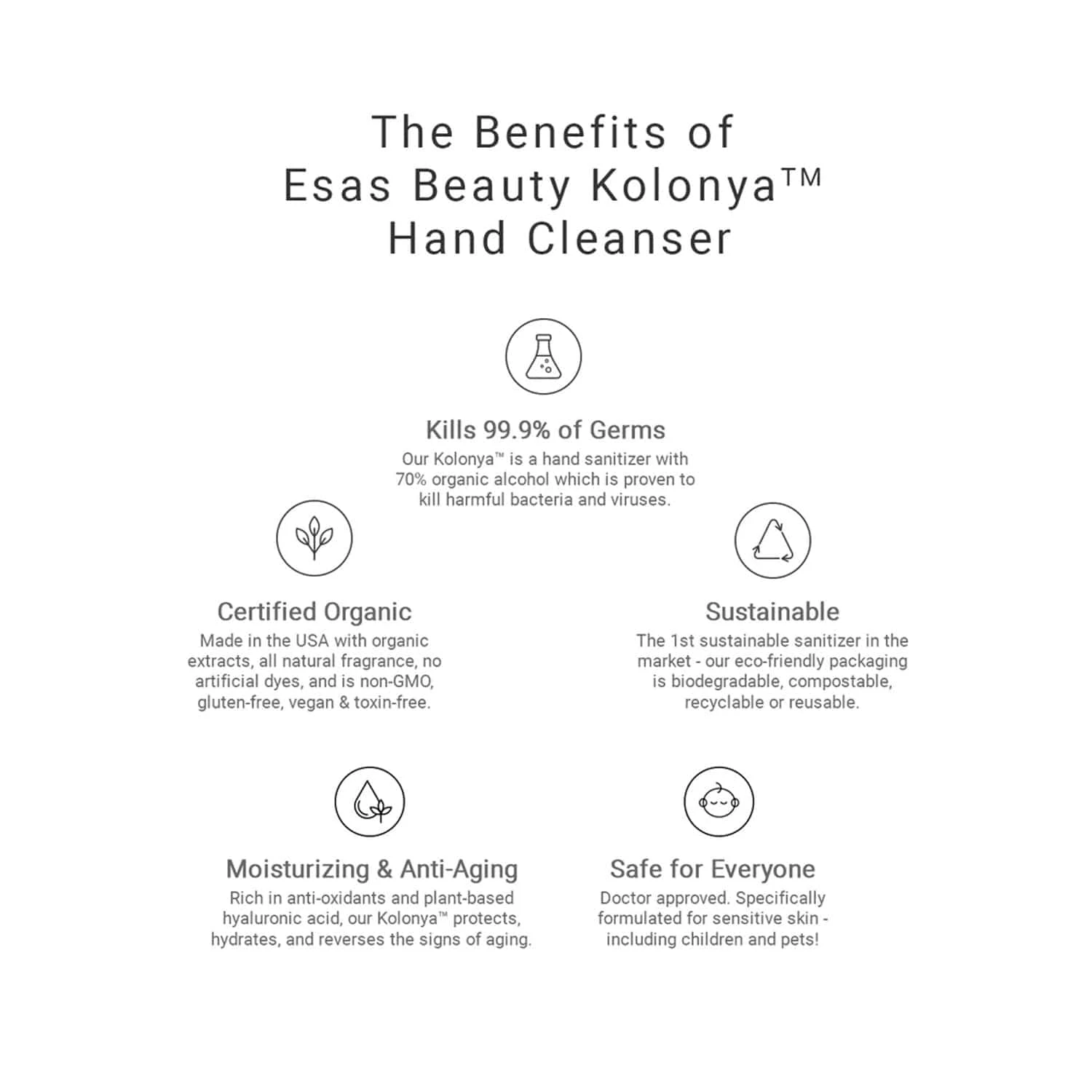WHAT IS KOLONYA? : A 4-in-1 rinse-free hand cleanser, hydrating serum, anti-oxidant boost, and refreshing mist all in one! Choose from 20 all-natural scents to boost your mood and feel refreshed. Comes in 3 different sizes. Our Esas Kolonya™ is based on a 200-year old Turkish tradition of welcoming guests with a hand-cleansing ritual upon entering the home.