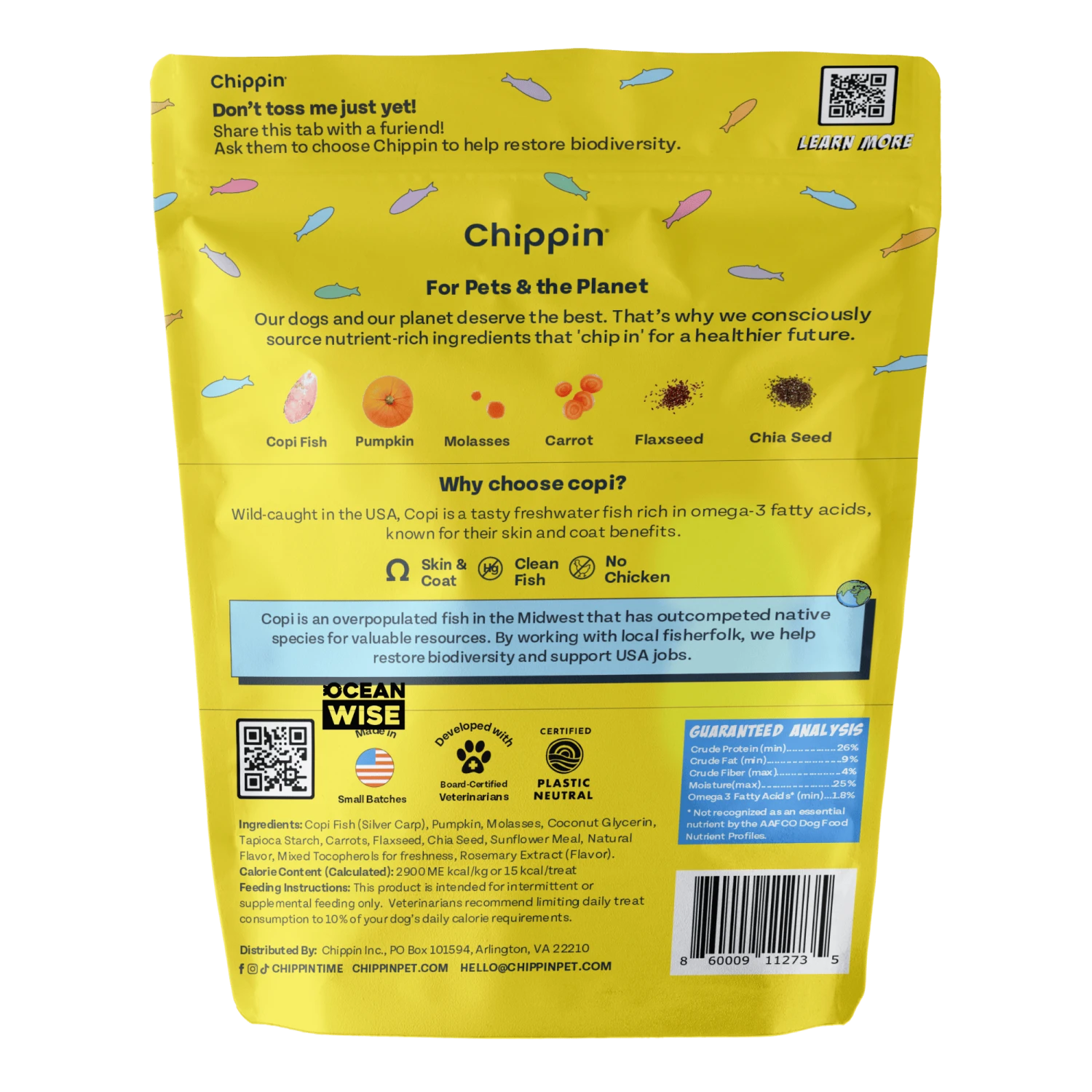 Chippin is committed to reducing the carbon pawprint with every bite. These treats are made using cricket protein, which uses significantly less land, water, and emits fewer greenhouse gases compared to traditional animal proteins. Sourcing is USA-based, ensuring reduced food miles and enhanced transparency.